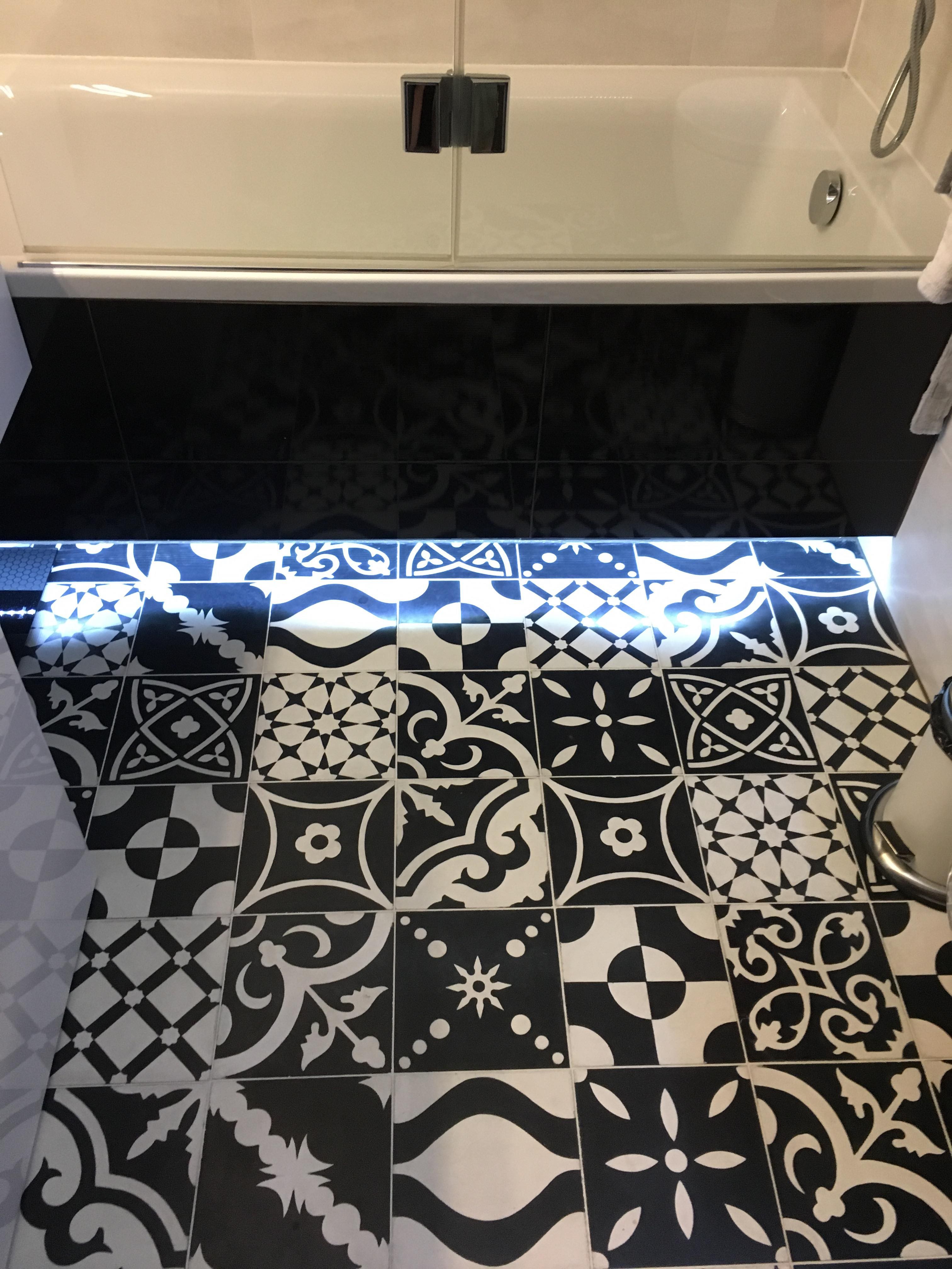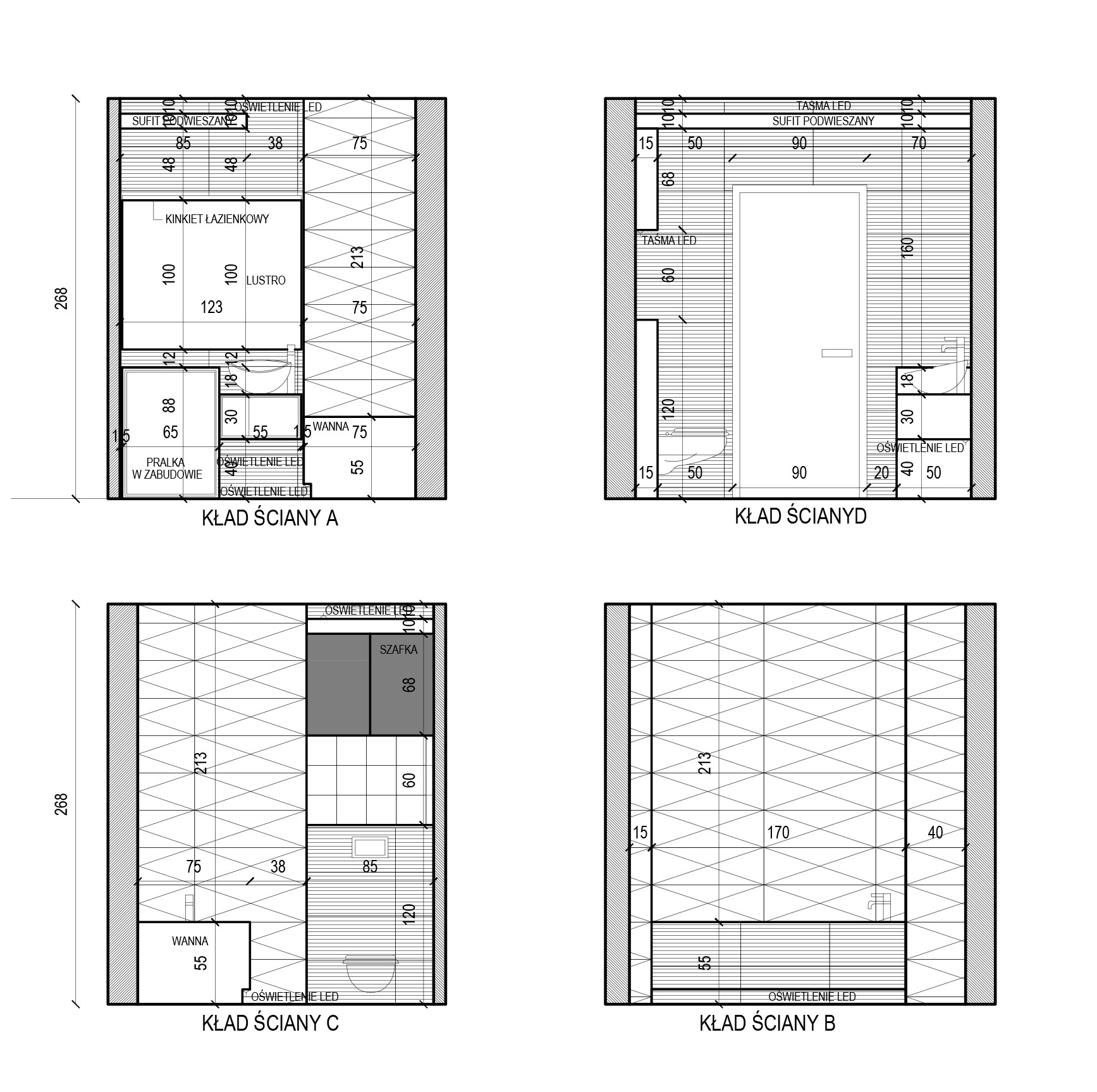 Kłady ścian (Elevations): Precyzyjnie rozplanowałam ułożenie wzorzystych płytek tak, aby motywy geometryczne idealnie schodziły się w narożnikach i przy zabudowach.