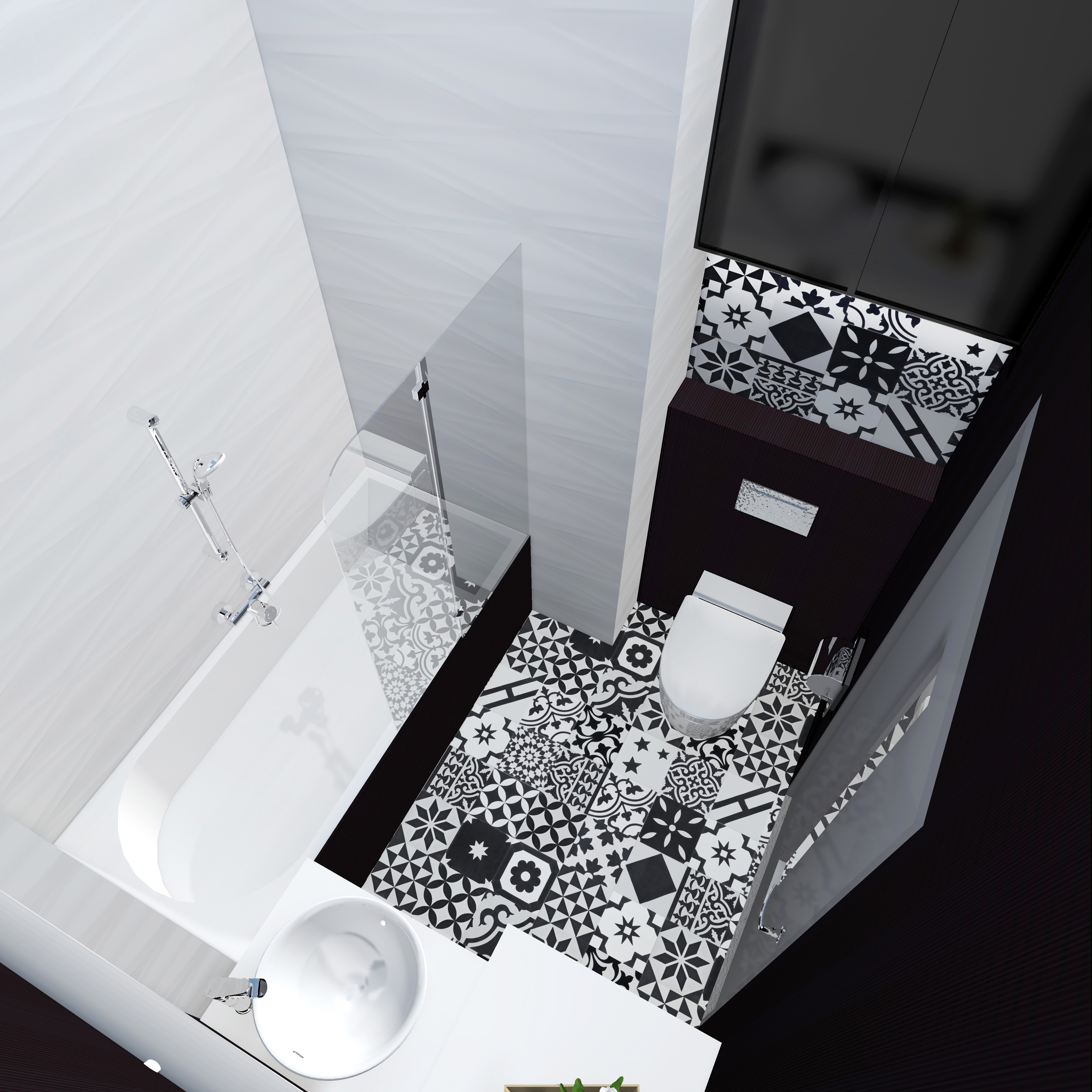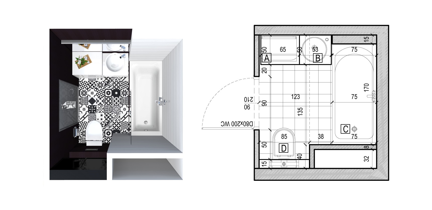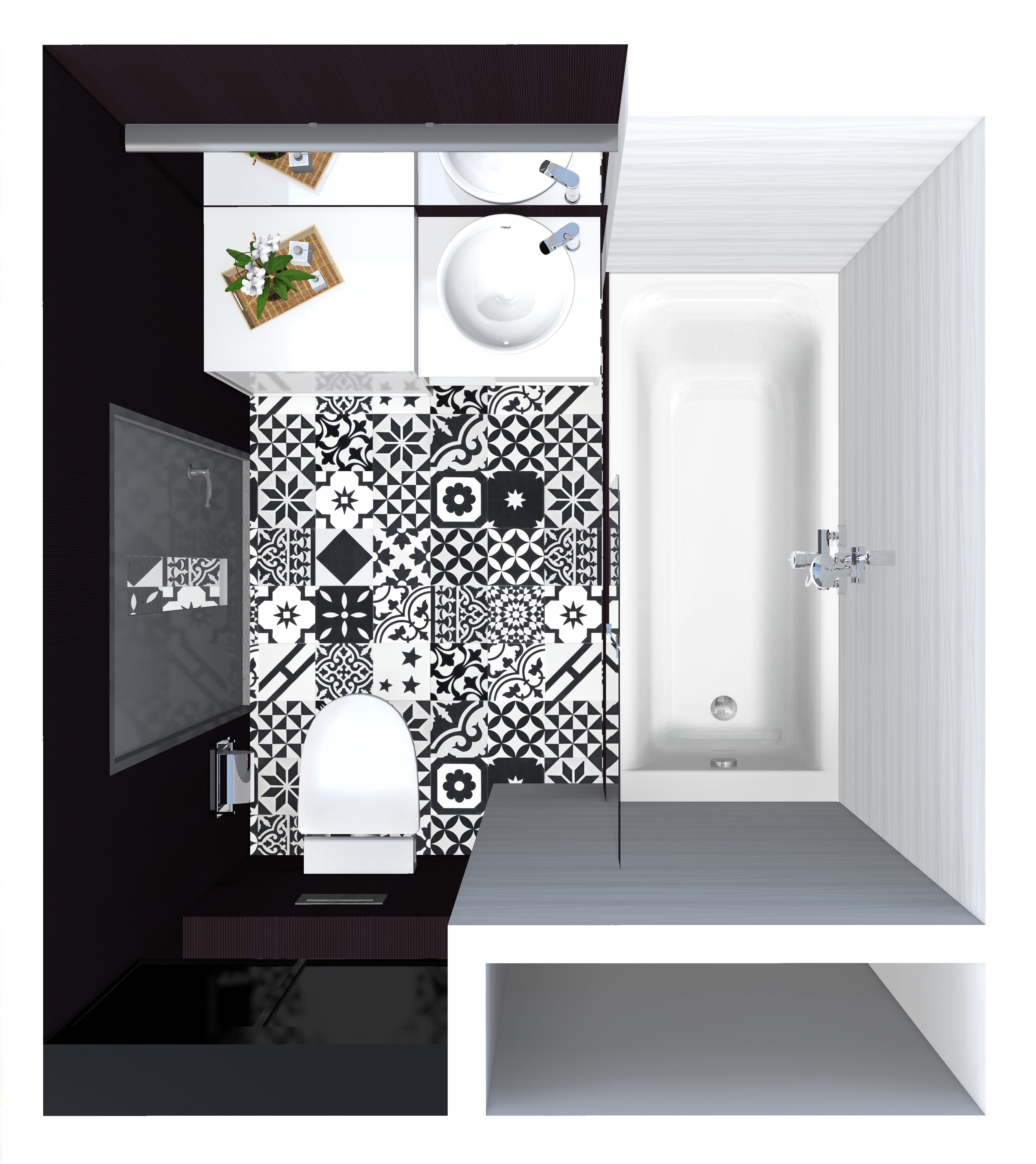 Optymalizacja przestrzeni: Na rzucie funkcjonalnym widać, jak mimo ograniczeń, udało mi się wygospodarować miejsce na pełnowymiarową wannę, strefę WC z ukrytą szafką oraz ergonomiczną umywalkę z obszernym blatem.