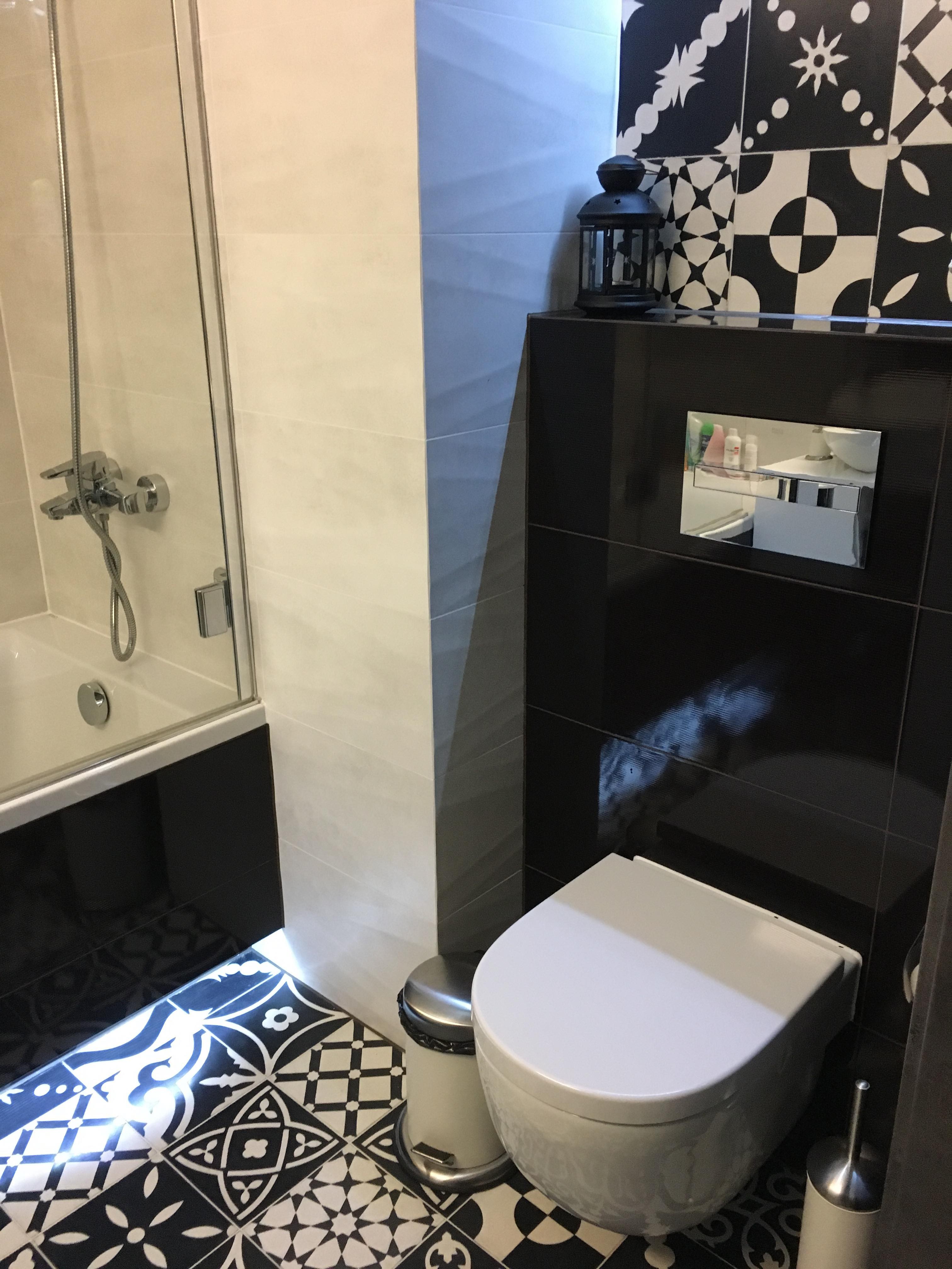 W tym projekcie postawiłam na bezkompromisowe połączenie czerni i bieli. Moim celem było stworzenie wnętrza z charakterem, które mimo niewielkiego metrażu (ok. 3,5 m²), zaskakuje głębią i dbałością o detal techniczny.
