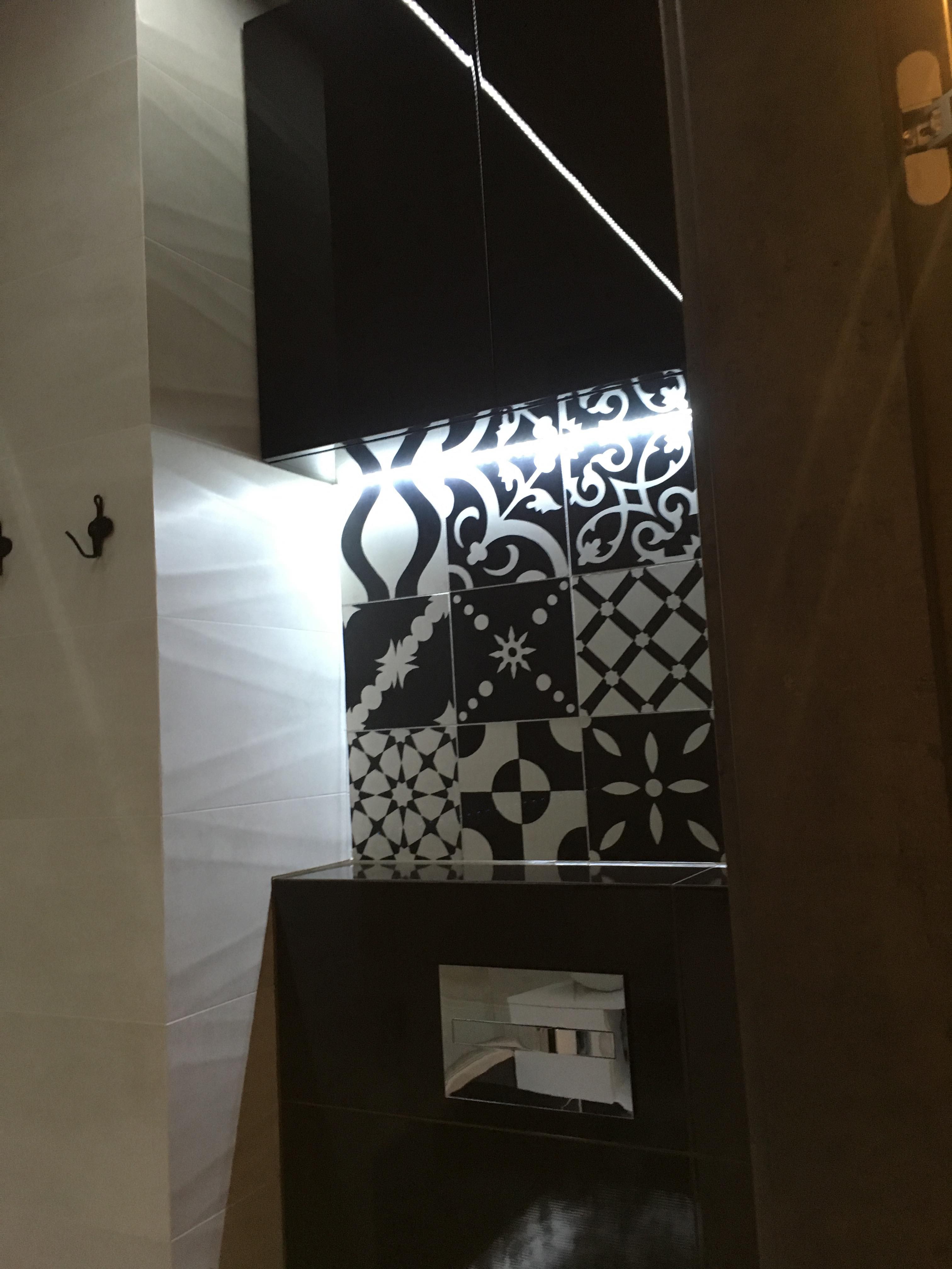 Kontynuacja motywu: Aby zachować spójność, ten sam wzór zastosowałam jako akcent nad zabudową stelaża podtynkowego, co wizualnie „podnosi” sufit i dodaje wnętrzu dynamiki.
