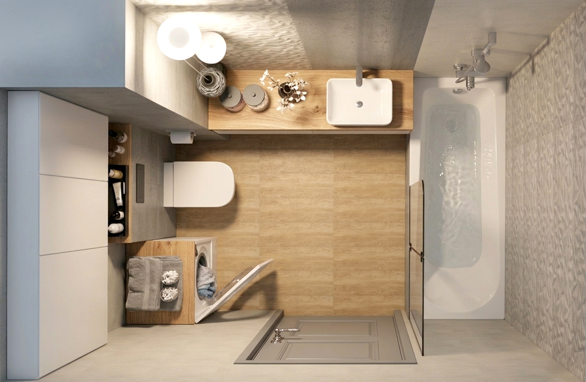 • Strefa gospodarcza: Pralkę umieściłam w zabudowie pod drewnianym blatem, obok szafki podumywalkowej. Dzięki temu zyskałam długą linię blatu roboczego, który optycznie wydłuża łazienkę.
