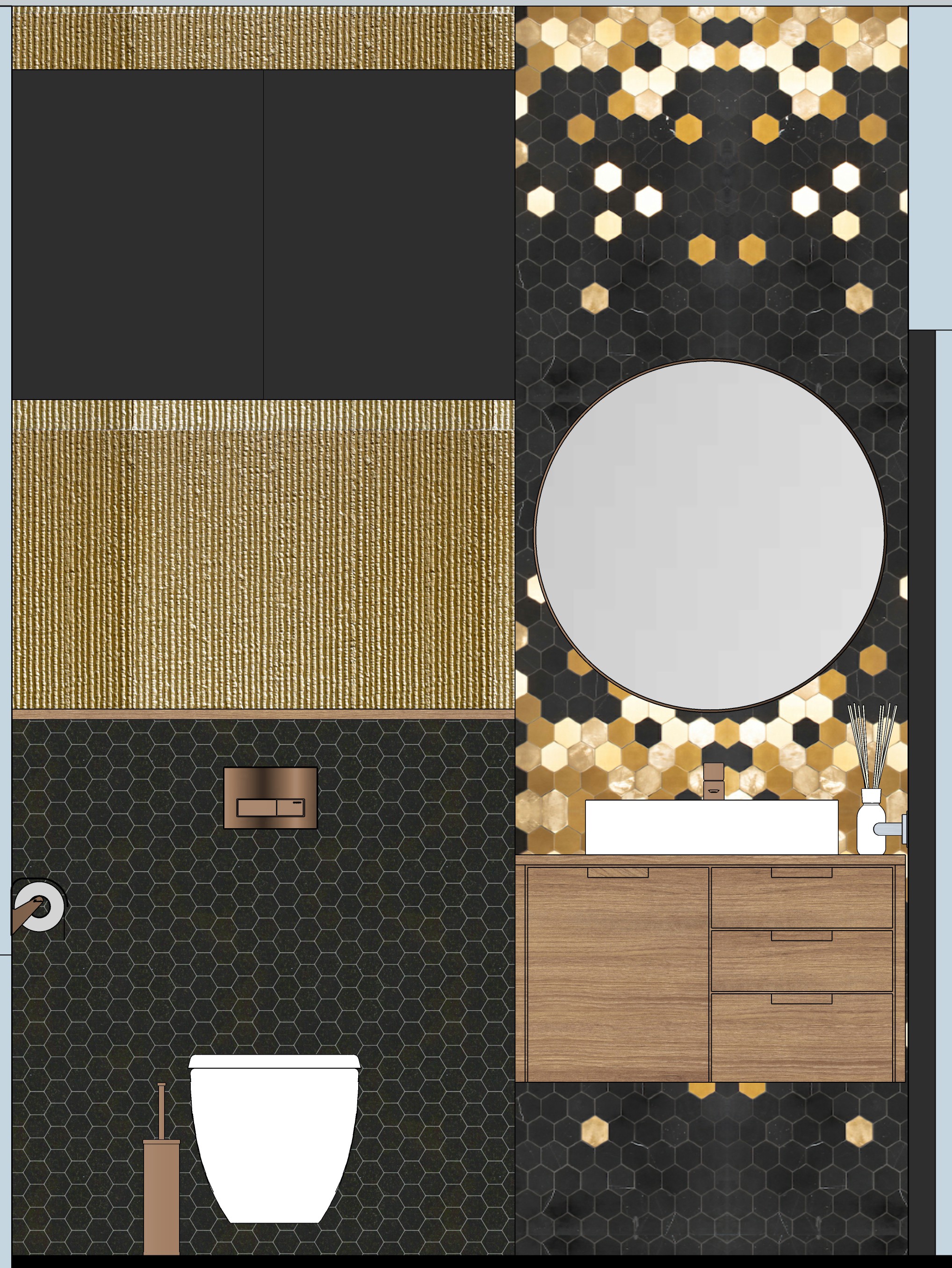 Motyw heksagonalny: Ściana pod prysznicem oraz podłoga zostały pokryte mozaiką w kształcie plastra miodu. Połączenie matowej czerni z akcentami starego złota nadaje łazience biżuteryjny charakter.