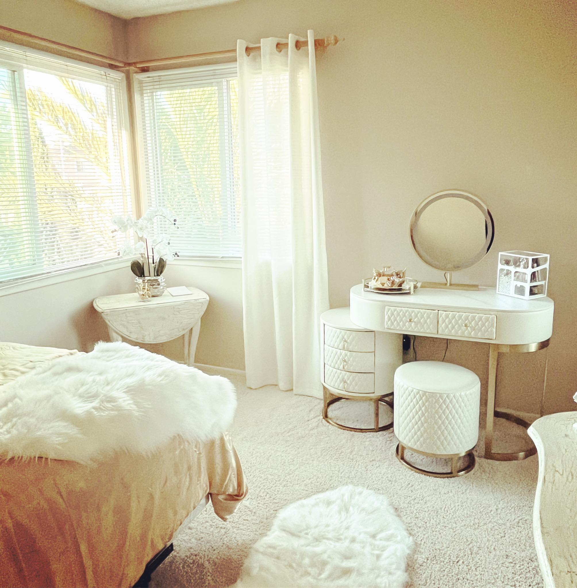 Centrum Pielęgnacji: Wybrałam nowoczesną, białą toaletkę o pikowanej strukturze i złotym stelażu, która wraz z okrągłym lustrem tworzy elegancką strefę przygotowań.