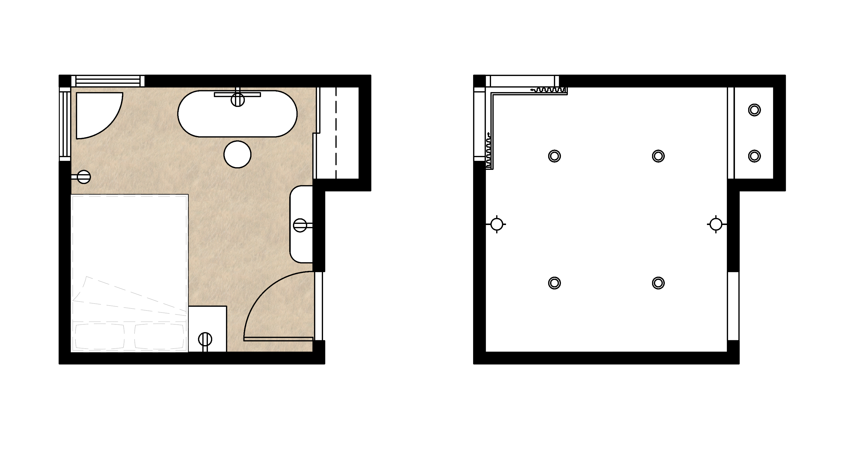 System oświetlenia: Zaprojektowałam rozmieszczenie punktowych opraw sufitowych, które dopełniają ogromne narożne okna, zapewniając idealne doświetlenie sfery wypoczynku i pielęgnacji również po zachodzie słońca.